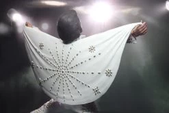 Er trägt einen weissen Overall, der mit verschiedensten Pailletten und Schmuck verziert ist. Dieses Outfit ist weltbekannt.