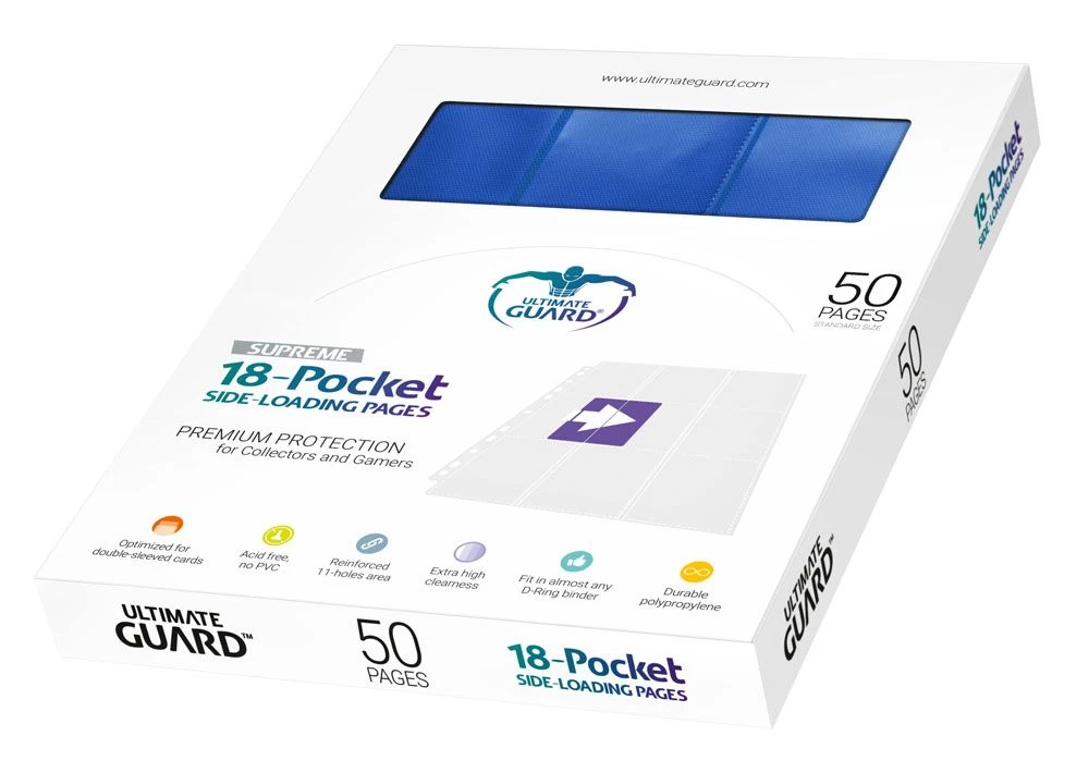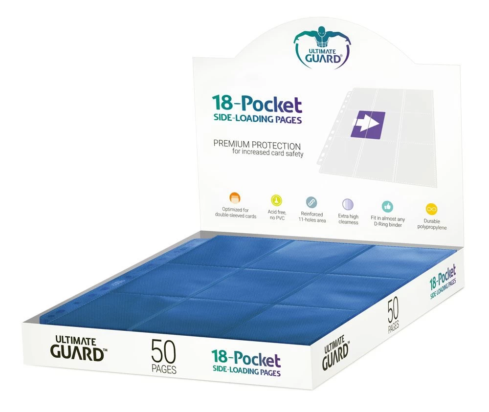 Hochwertige, doppelseitige Ordnerseiten (18 Taschen, 9 Taschen je Vorder- und Rückseite), passend für nahezu jeden Ringordner dank 11er-Lochung mit doppelt verstärkter Lochleiste. Jedes Pack enthält 50 Seiten für den Transport und die sichere Aufbewahrung von insgesamt mindestens 900 Karten (18 je Page) in zwei Hüllen (double-sleeved).