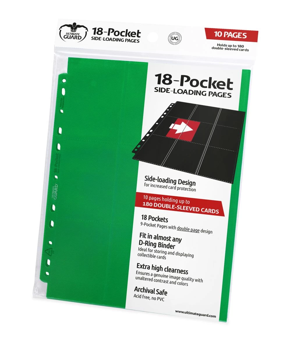 Hochwertige, doppelseitige Ultimate Guard Ordnerseiten (18 Taschen, 9 Taschen je Vorder- und Rückseite), passend für nahezu jeden Ringordner dank 11er-Lochung mit doppelt verstärkter Lochleiste. Jedes Pack enthält 10 Seiten für den Transport und die sichere Aufbewahrung von insgesamt mindestens 180 Karten (18 je Page) in zwei Hüllen (double-sleeved).