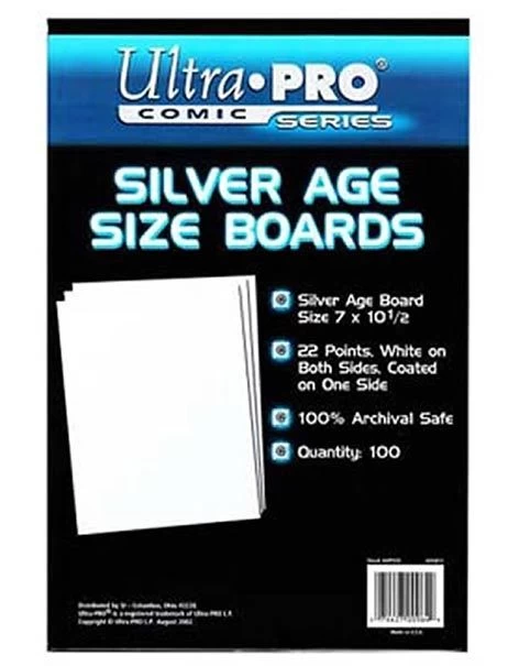 Pack mit 100 Stück weißen Comic Backing Boards (Titeltrenner) von Ultra Pro. Maße: Silver Age Size (ca. 17,8cm x 26,6cm)