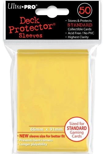 Päckchen mit 50 Deck Protectors (Sleeves) für Sammelkarten im Standardformat. Farbe: Gelb, Maße: 66mm x 91mm, Ultraklare Front, Säure- und PVC-freies Material.